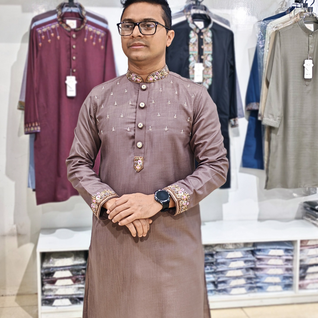 Add sophistication to your traditional wardrobe with our Charcoal Rose Zardozi Panjabi. Crafted from premium fabric in a rich charcoal shade, this Panjabi features intricate zardozi embroidery with delicate rose motifs, giving it a timeless and luxurious look.