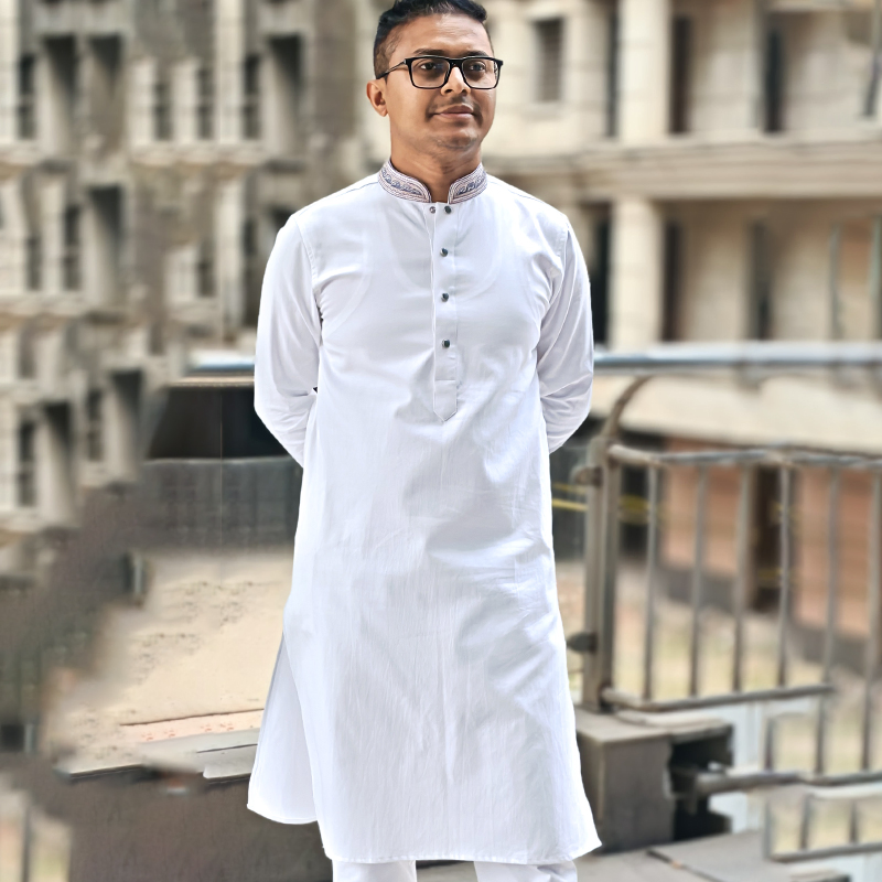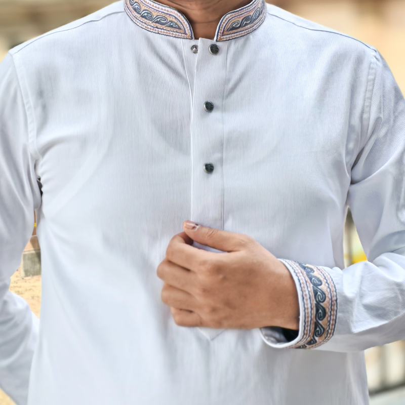 Celebrate Eid in timeless elegance with our White Embroidery Panjabi. Crafted from premium breathable fabric, this piece blends classic tradition with refined detailing. Intricate embroidery work on the collar & sleeve cuffs adds a touch of sophistication without overpowering the purity of white.