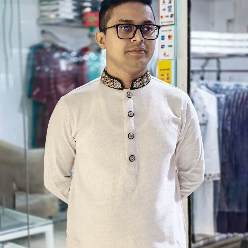 Experience the perfect blend of luxury and comfort with our comfort-fit Zardozi Panjabi, exquisitely tailored from premium cotton for a subtly textured and refined look. The relaxed silhouette drapes with effortless elegance, offering breathability and ease without sacrificing style. Featuring intricate zardozi embroidery woven with shimmering metallic threads, this piece pays homage to traditional artistry while embracing modern sophistication. Ideal for festive occasions, cultural gatherings, or weddings, it’s a timeless expression of grandeur where heritage and contemporary charm intertwine.