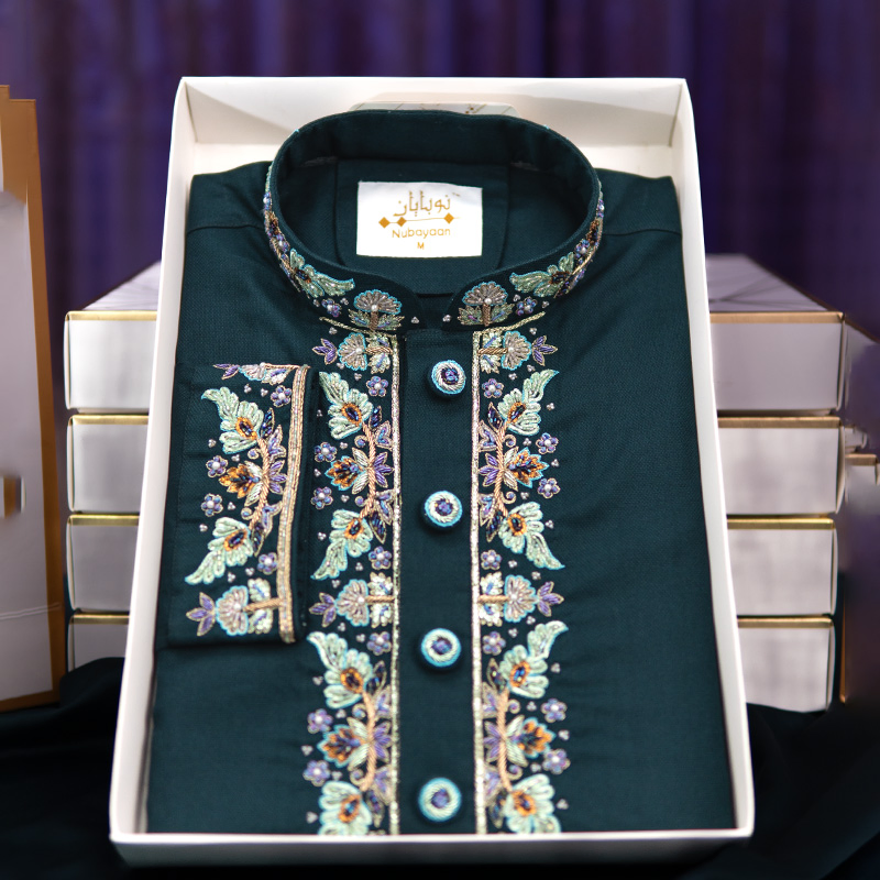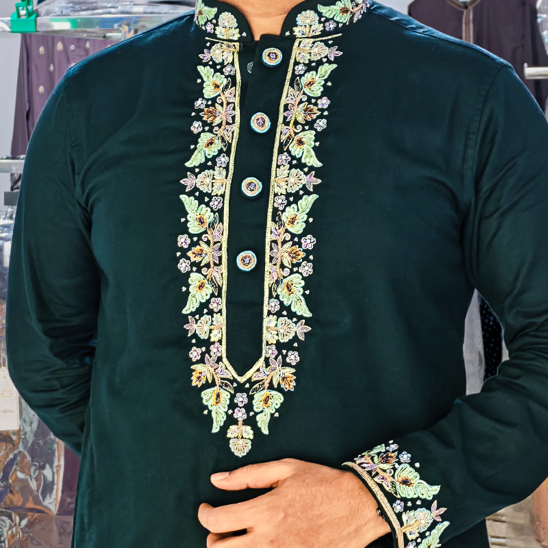 This Forest Green color zardozi panjabi is made from fine cotton and features heavy Zardozi work on the chest, collar and sleeve opening. The combination of volume, dhopka, sequence, pipe, pearl, zari yarn and gorgeous button enhance its premium feel. Perfect for any special occasion, this meticulously crafted panjabi elevates your look for any event.