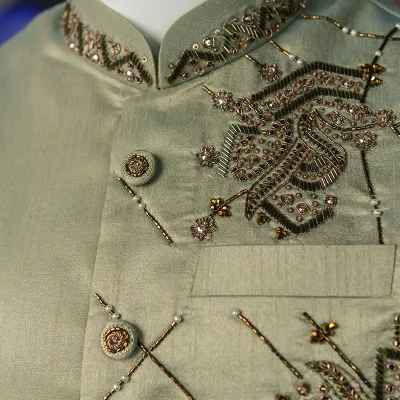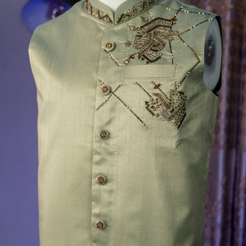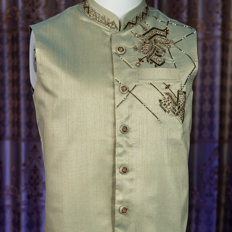 Upgrade your style with our meticulously crafted waist coat, made from premium Indian Tashar. The exquisite embellishments on the front add a touch of opulence to this classic attire, perfect for weddings and special occasions. Elevate your look and make a lasting impression with this high-quality and sophisticated waist coat.