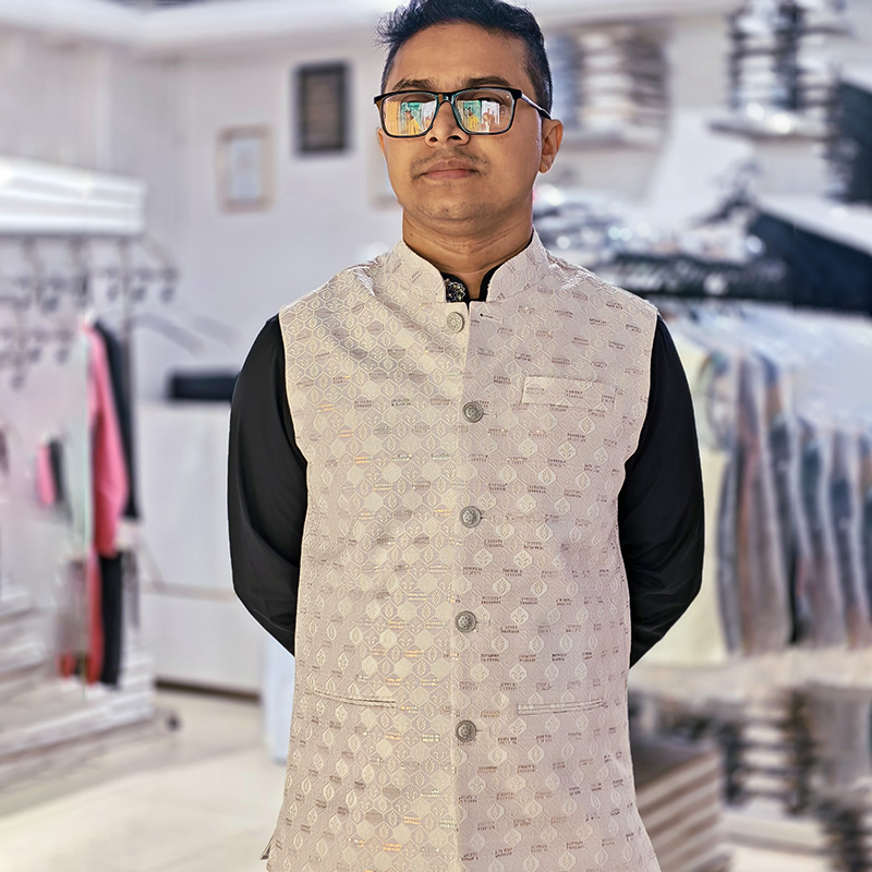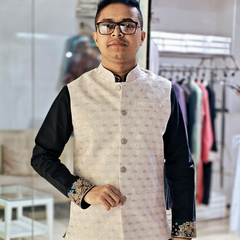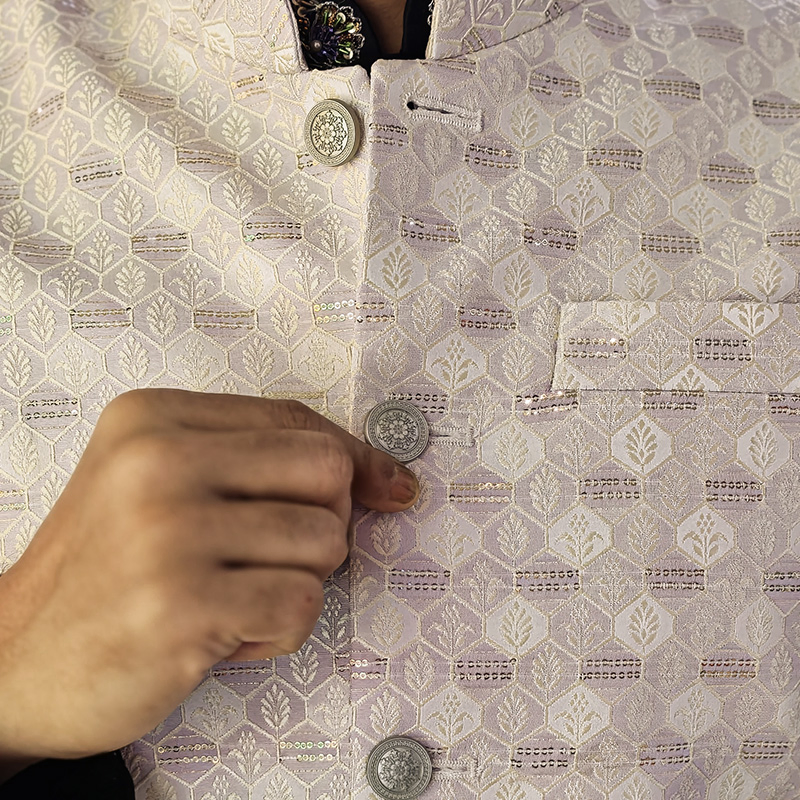 Refined elegance meets contemporary craftsmanship in this classic waistcoat. Tailored from silk fabric, it features a structured mandarin collar and a regular fit for a timeless appeal. The hexagoan print, enhanced with an embroidered motif, adds a subtle texture, making it a statement piece. Designed with functionality in mind, it includes a hidden chest pocket and waist bone pockets. The straight-cut hip hem ensures a clean silhouette, while the show fabric buttons complete the polished look.