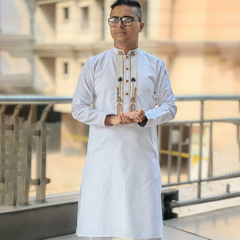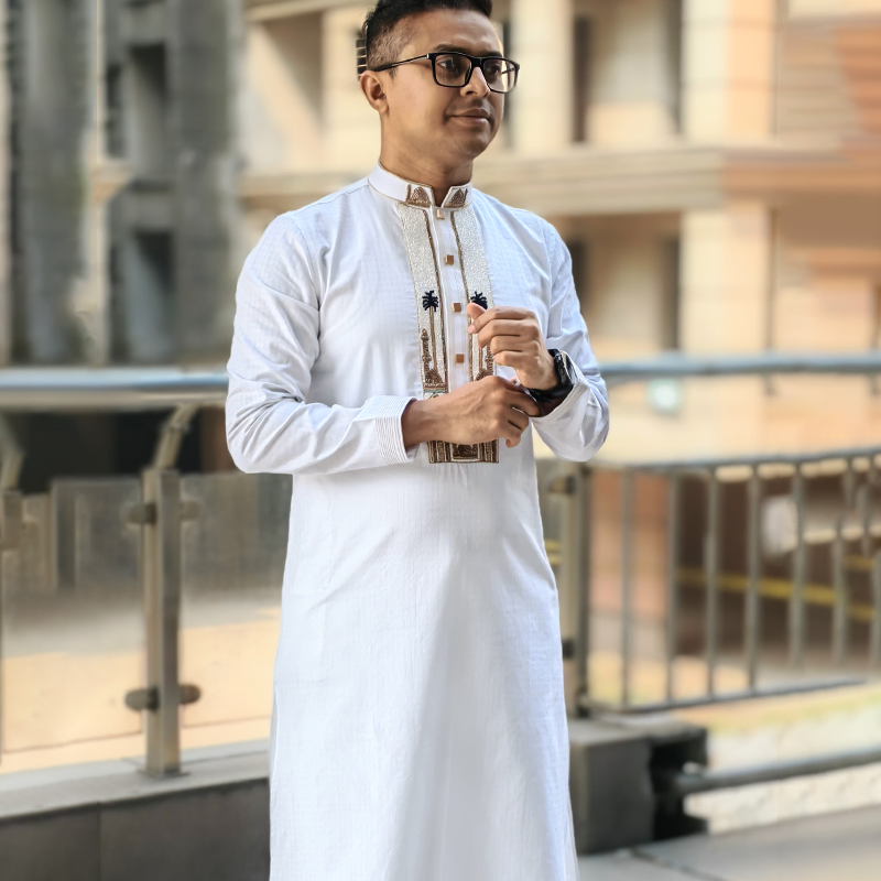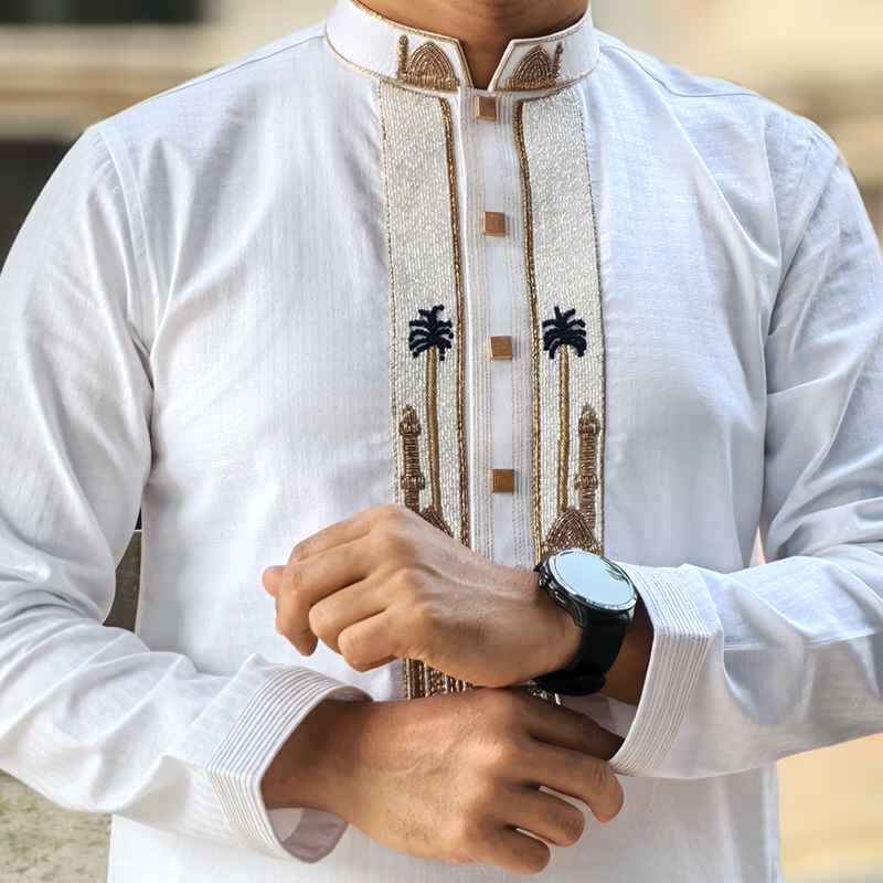 Inspired by the timeless beauty of mosque architecture, the Mosque Minaret Zardozi Panjabi brings a touch of heritage and elegance to your Eid wardrobe. The intricate zardozi embroidery on the front placket is carefully designed with a mosque minaret–inspired motif, creating a refined and graceful look.