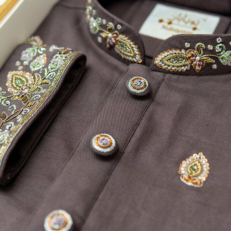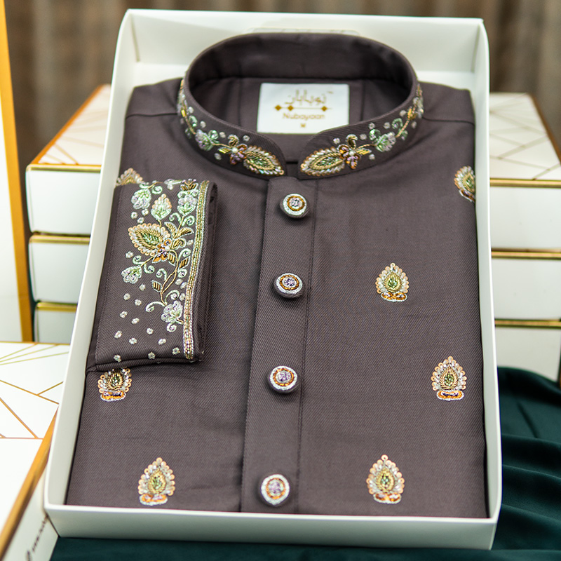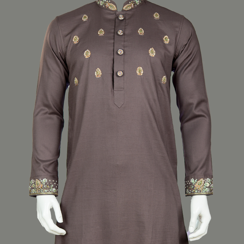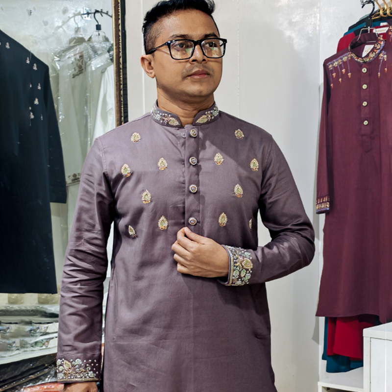 Immerse yourself in sophistication with this premium white zardozi Panjabi that offers timeless elegance. The collar, half body and cuffs comes alive with smoldering zardozi work, while the placket features eye-catching decorative buttons, adding a touch of modern flair. Perfect for any special occasion, this meticulously crafted panjabi elevates your look for any event.